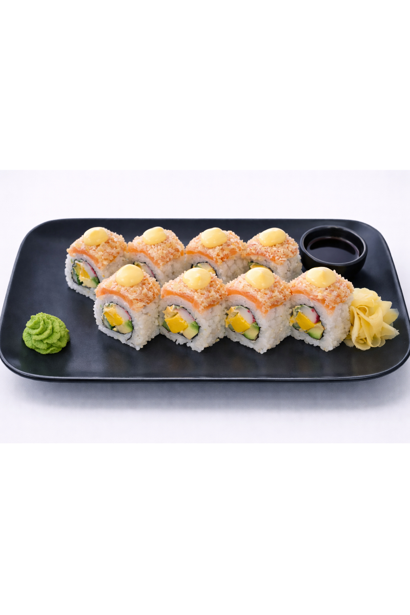 crabsticks, mango, agurk, philadelphia ost, chili mayo, toppa med laks, crunchy flakes og plomme saus