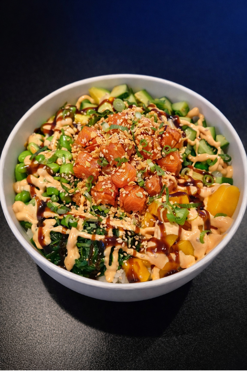 Laks, paprika, avokado, agurk, mango, edamame, sjøgress, ris Toppet med chili mayo, teriyaki, sesam og vårløk
